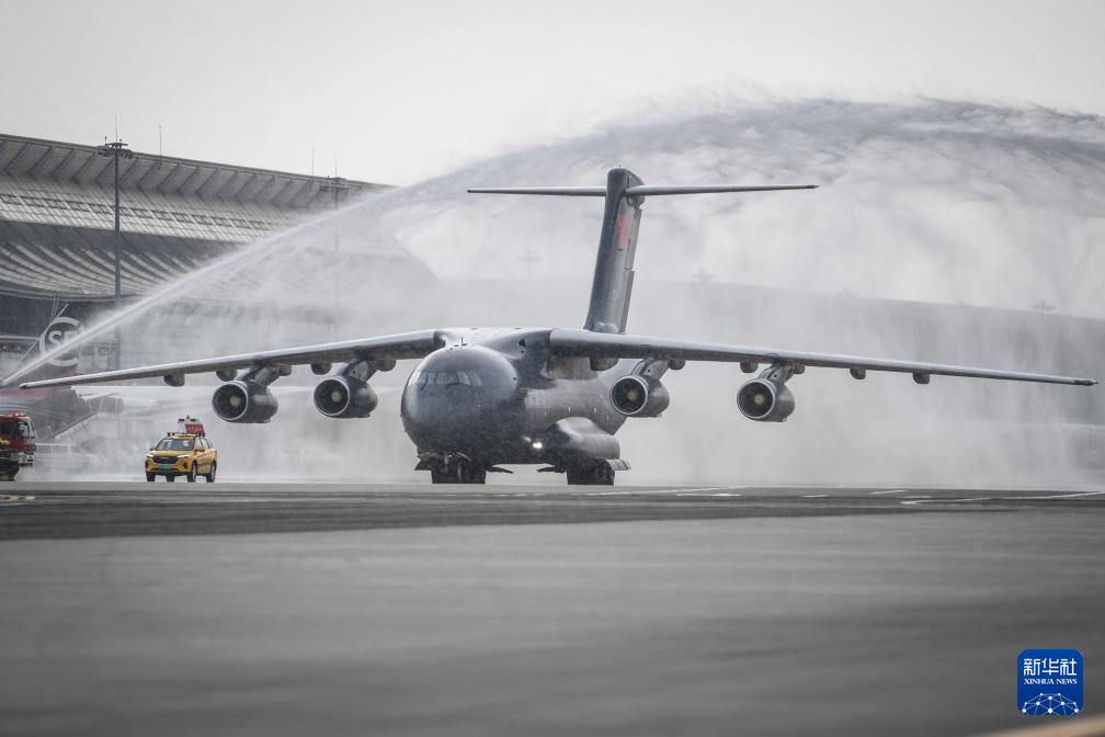 11月23日,在沈阳桃仙国际机场,运送志愿军烈士遗骸的空军专机通过水门。新华社记者 潘昱龙 摄pagebreak