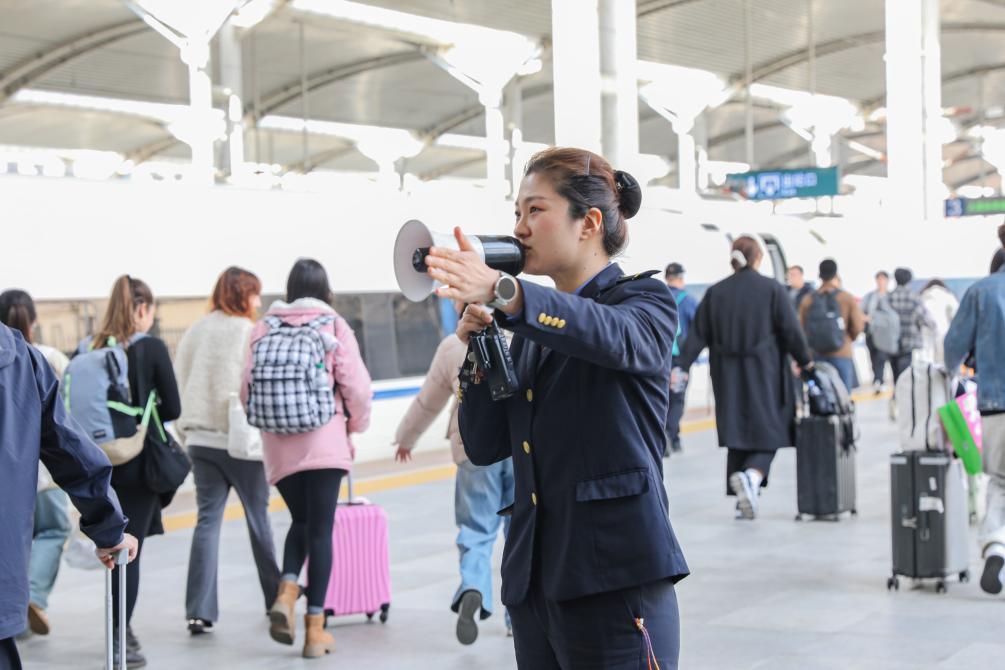 大连站工作人员引导旅客有序出行。(大连站供图)
