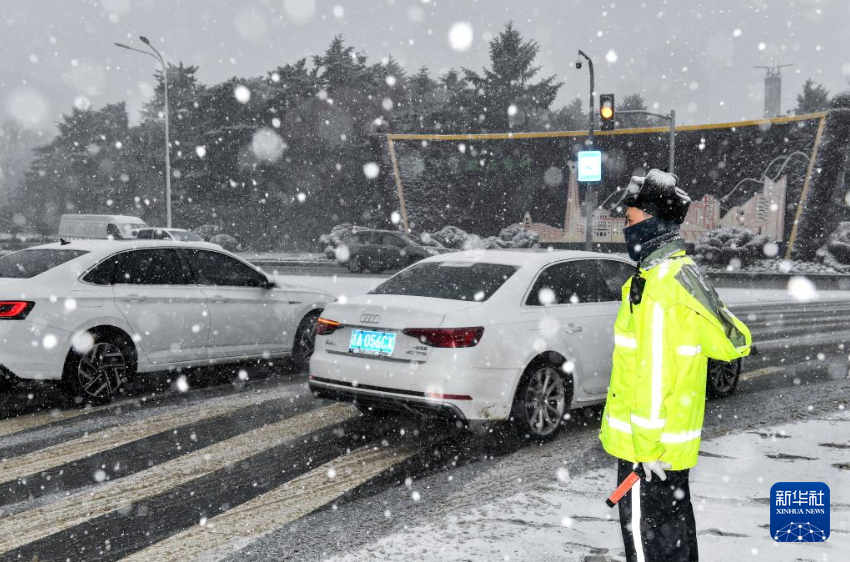 6日,在吉林省长春市,一名执勤交警在雪中指挥交通。新华社记者许畅 摄