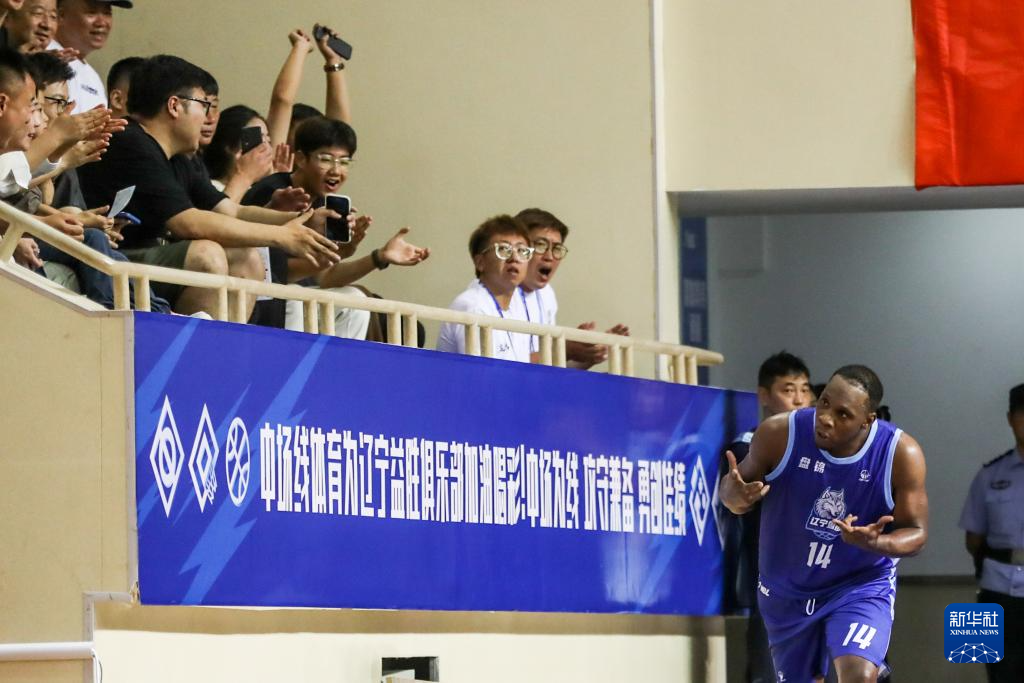 7月14日,辽宁益胜雪狼队球员哈德森在比赛中庆祝得分。新华社记者 潘昱龙 摄