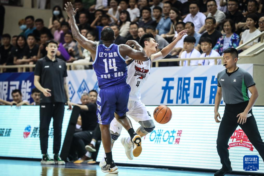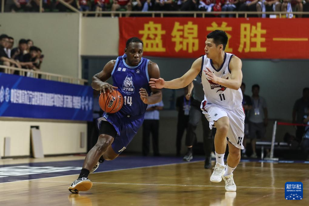 7月14日,辽宁益胜雪狼队球员哈德森(左)与武汉锟鹏队球员王晓明在比赛中拼抢。新华社记者 潘昱龙 摄pagebreak