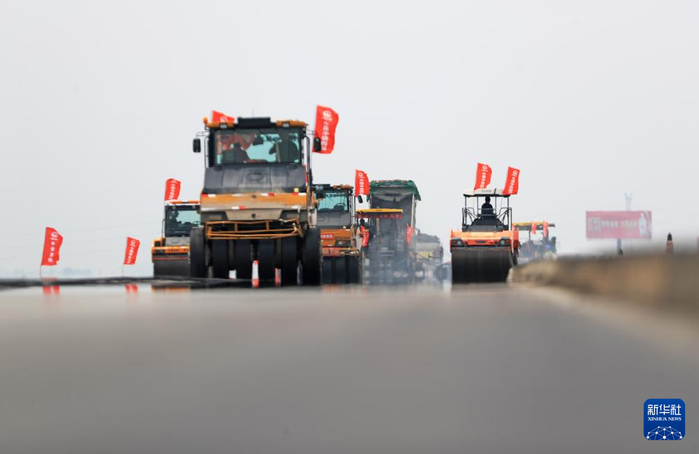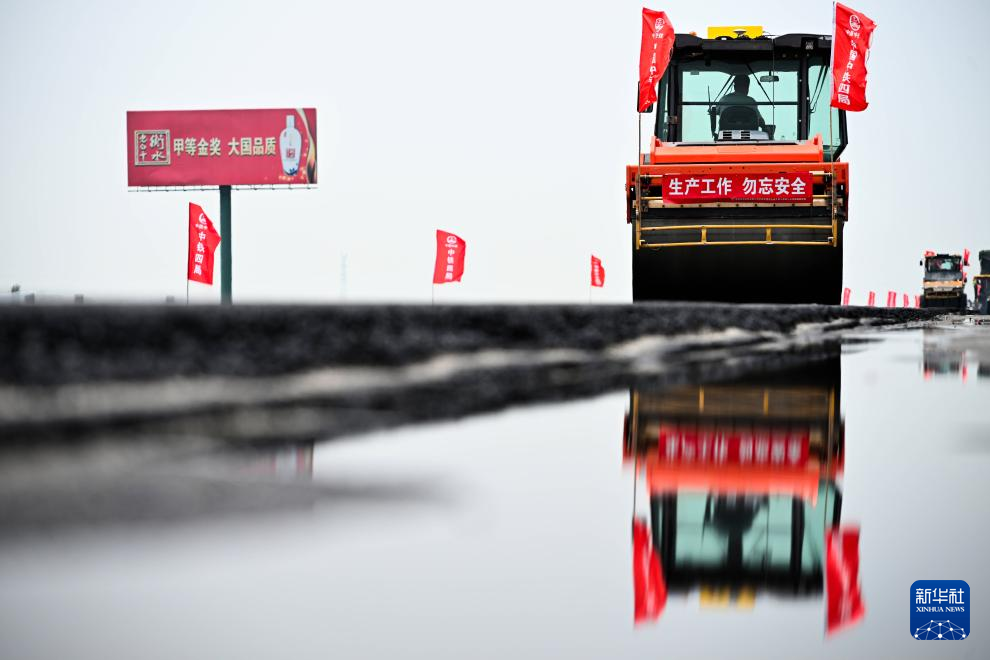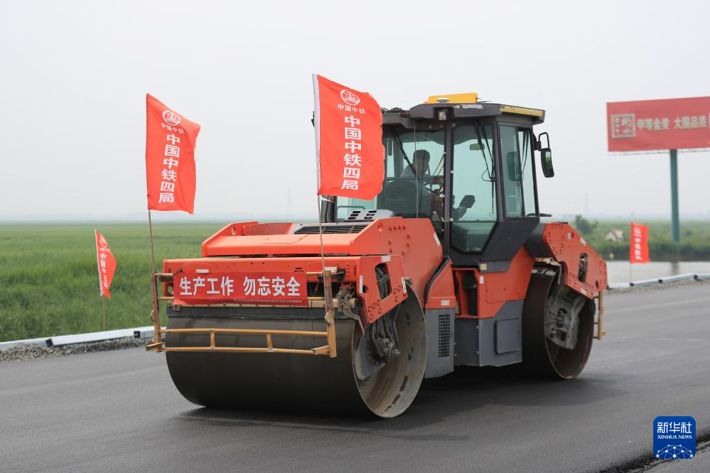 7月4日,在京哈高速公路辽宁段改扩建工程项目施工现场,中铁四局建设者进行路面沥青摊铺作业。