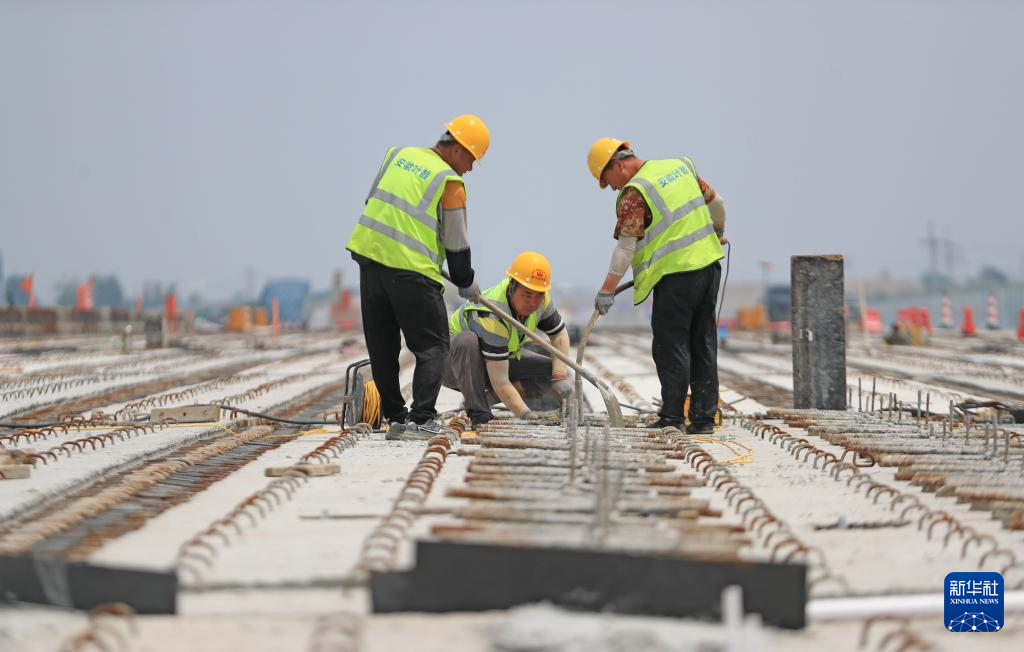 7月4日,在京哈高速公路辽宁段改扩建工程项目施工现场,中铁四局建设者进行桥面施工作业。