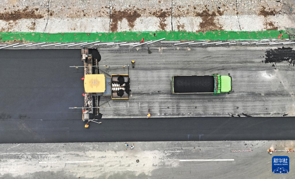 7月4日,在京哈高速公路辽宁段改扩建工程项目施工现场,中铁四局建设者进行路面沥青摊铺作业(无人机照片)。