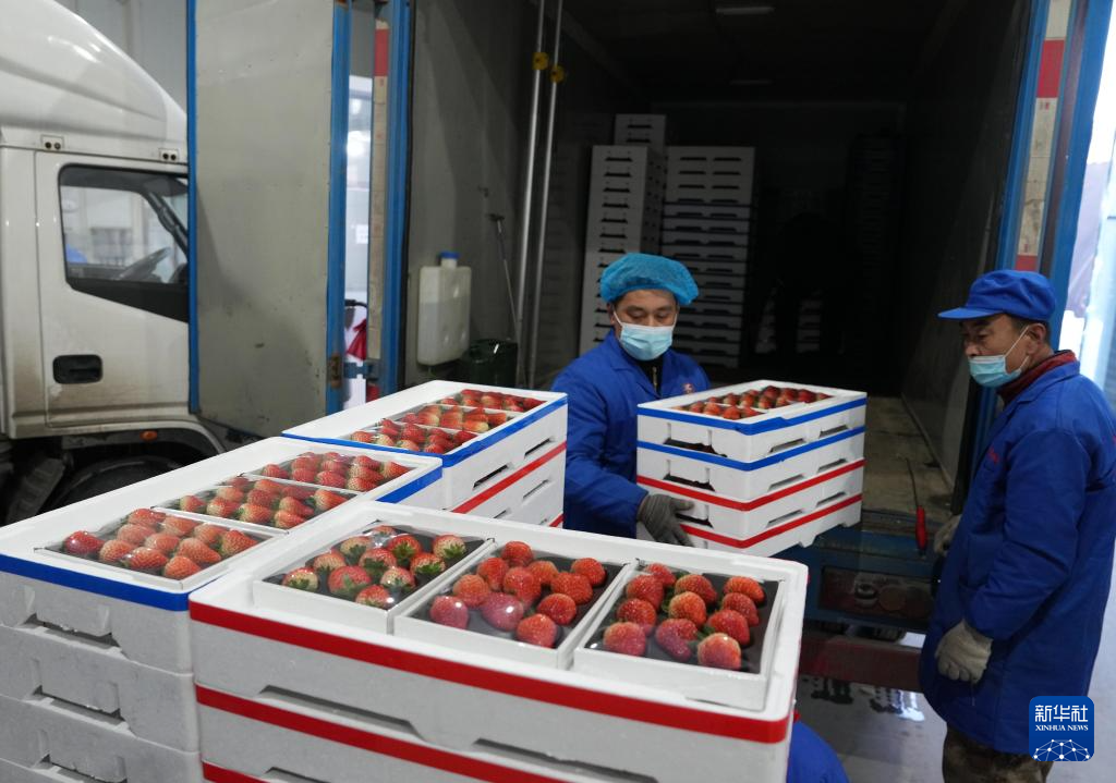 在东港的一处草莓包装车间,完成装箱的草莓将运往各地(1月9日摄)。新华社记者 李钢 摄