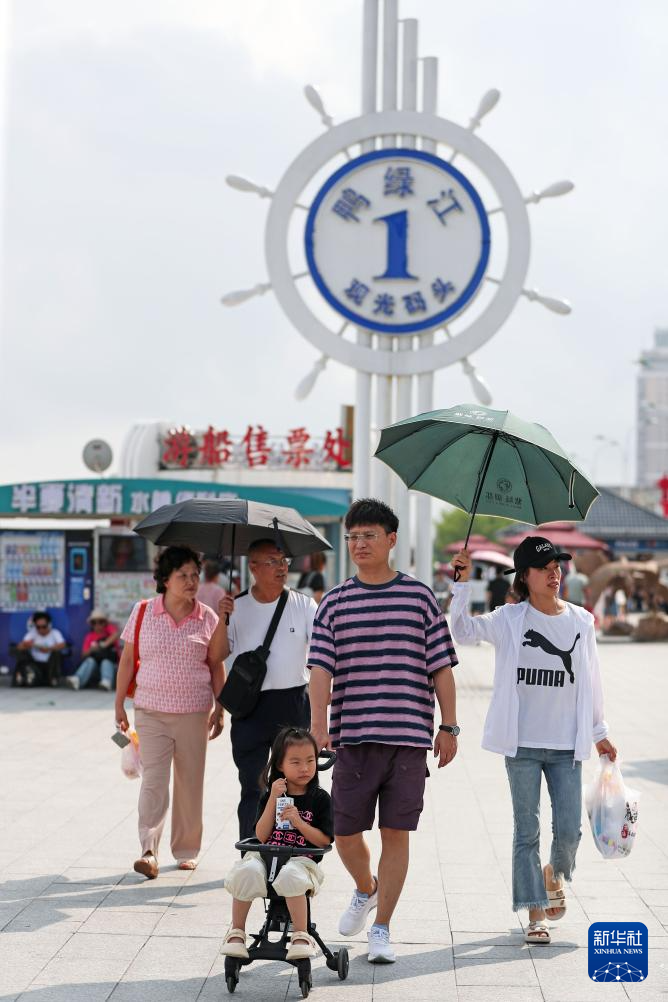 8月2日,游客在鸭绿江畔游览。新华社记者 龙雷 摄