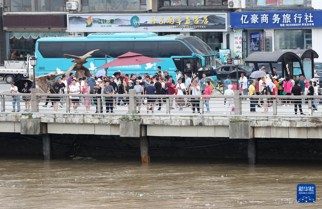 当日,位于辽宁省丹东市的鸭绿江畔人头攒动,随着鸭绿江水势回落,沿江道路恢复通车,许多游客来这里参观游览。