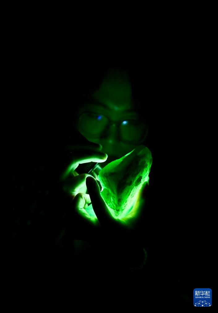 5月30日,唐校在“玉三生”工作室内查看岫玉原料纹理。