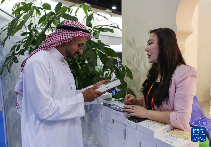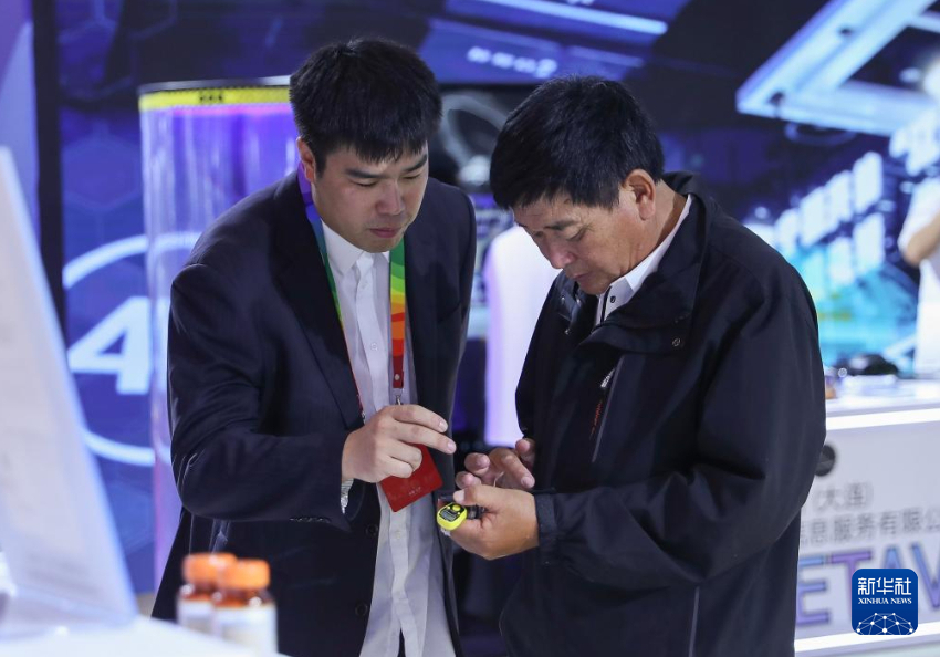 9月25日,参展商(右)在2023辽宁国际美丽健康产业博览会上介绍产品。新华社记者 龙雷 摄