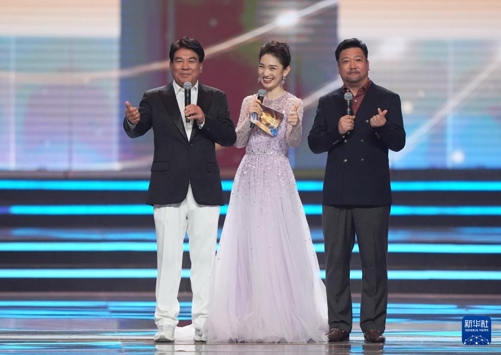 6月11日,演员朱时茂(左)、贾冰(右)作为活动的形象大使,在闭幕式现场与主持人和观众互动。