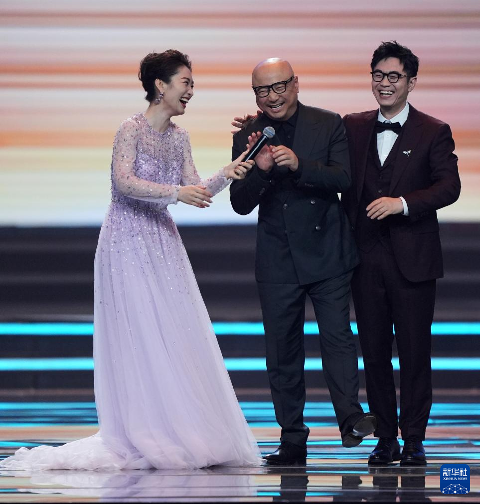 6月11日,导演徐峥(中)和大鹏(右)在闭幕式现场接受主持人采访。