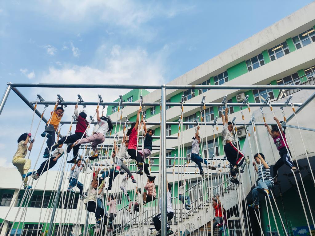 随着校园建设逐步完善,“大玩具”越来越多:教学楼边,是考验臂力和平衡能力的“31根绳索横渡”,能够从头至尾攀援的孩子可以获得“校长奖”;食堂的屋顶上,被改造成小轮车训练基地;地下停车场的一部分改成荡桨池,并安装陆上测功仪模拟赛艇动作和感受;操场上大大的造雪机,冬天造雪山,夏天则变身洒水机,让孩子在炎炎夏日享受玩水的快乐。