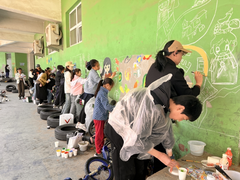 教学楼墙壁“变身”涂鸦墙,五彩画笔绘下童真故事。(受访单位供图)