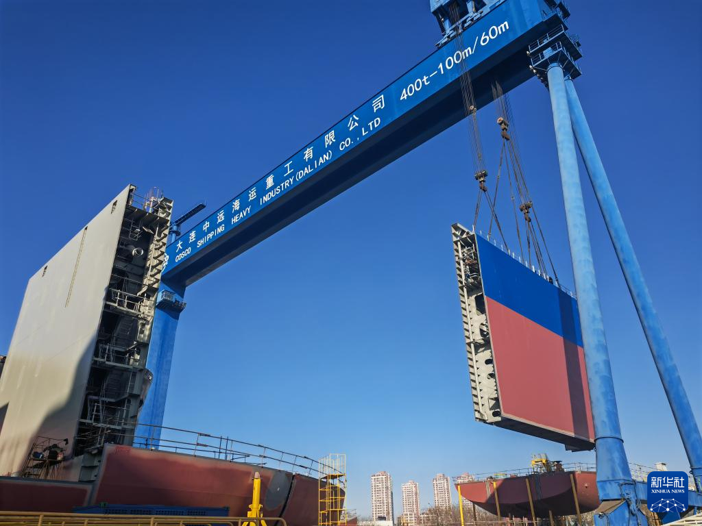 1日,大连中远海运重工有限公司的龙门吊正在吊装船舶构件。新华社记者郭翔 摄