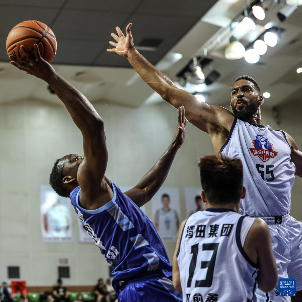 9月3日,长沙湾田勇胜队球员霍利费尔德(右上)防守辽宁益胜队球员哈德森(左)。新华社记者 潘昱龙 摄
