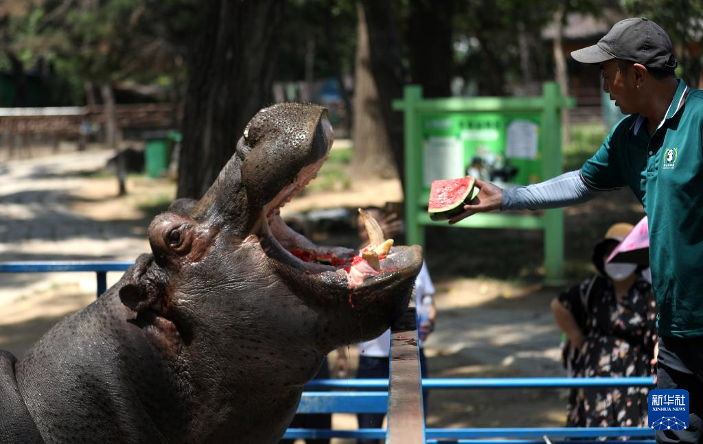7月1日,鞍山市动物园的饲养员给河马“欢欢”喂食西瓜。新华社记者 姚剑锋 摄