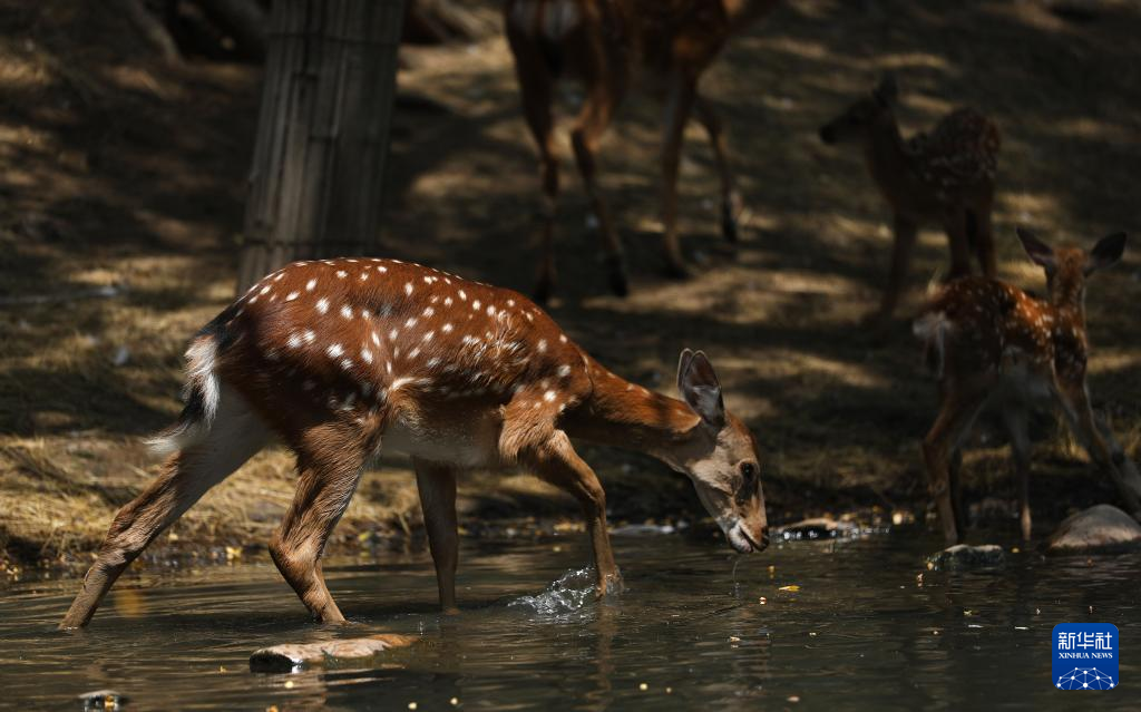 7月1日,几只梅花鹿在鞍山市动物园的小河旁避暑纳凉。新华社记者 姚剑锋 摄