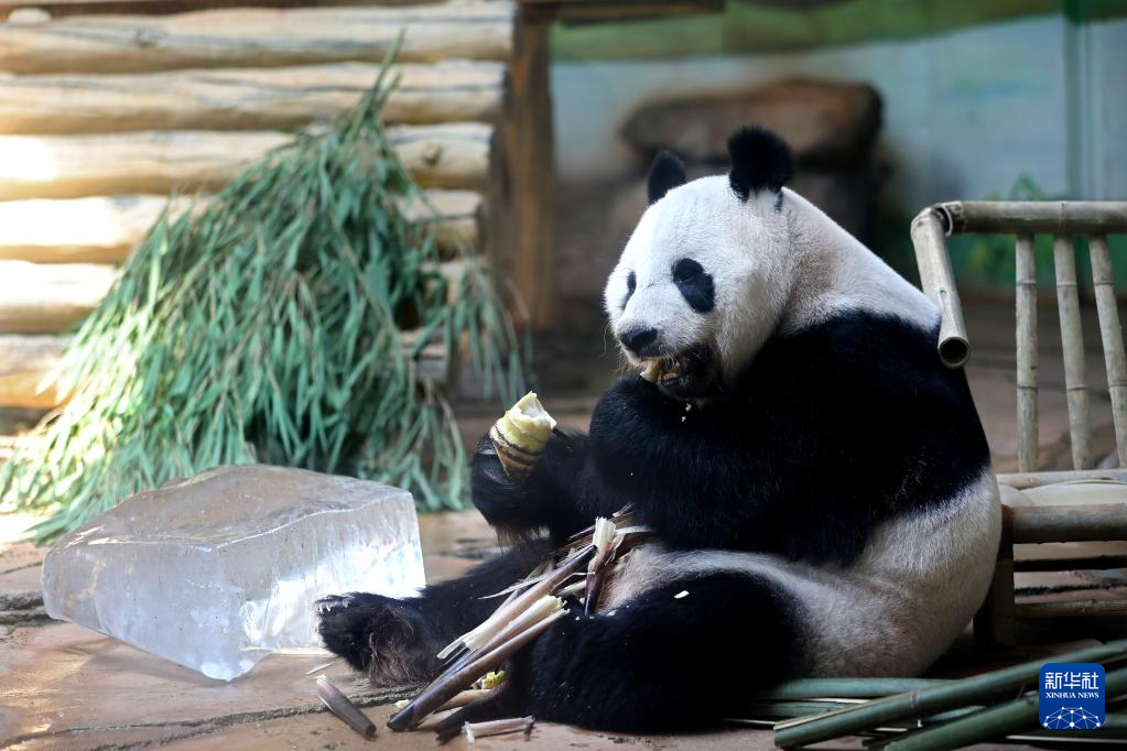 7月1日,鞍山市动物园熊猫馆里的雌性熊猫“杉杉”一边享受着空调,一边在冰块旁啃着竹笋。新华社记者 姚剑锋 摄pagebreak