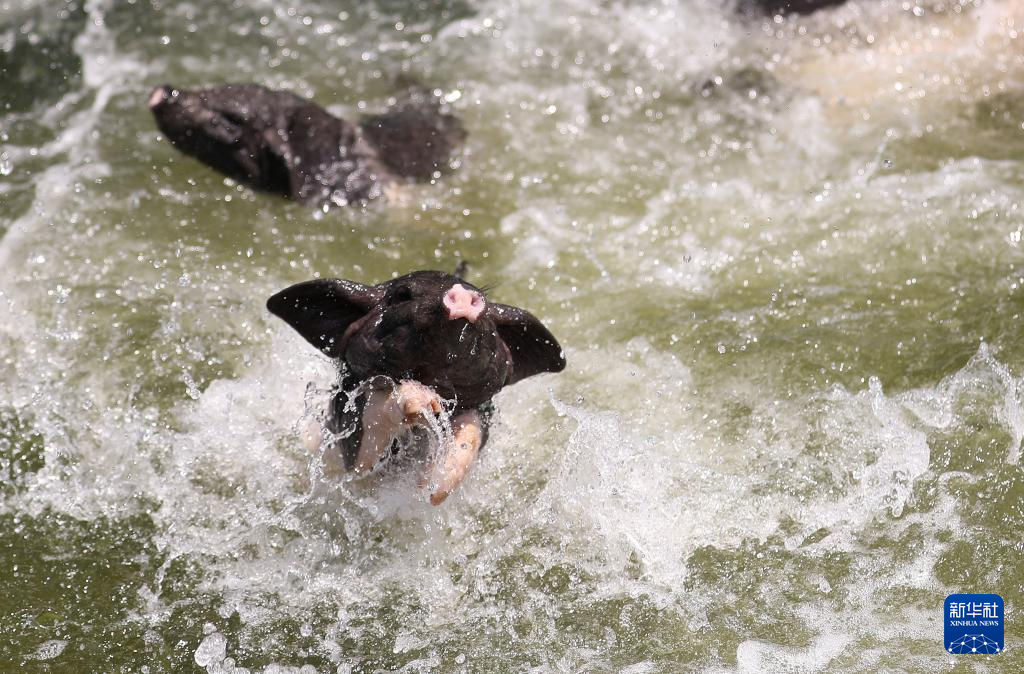 7月1日,几只小香猪在鞍山市动物园的一处水池里纳凉。新华社记者 姚剑锋 摄