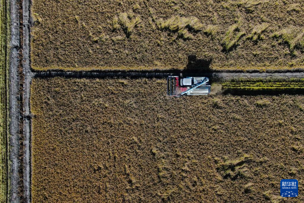 11月3日,农户驾驶农业机械在盘锦市大洼区王家街道兴海村收割水稻(无人机照片)。新华社记者 潘昱龙 摄pagebreak
