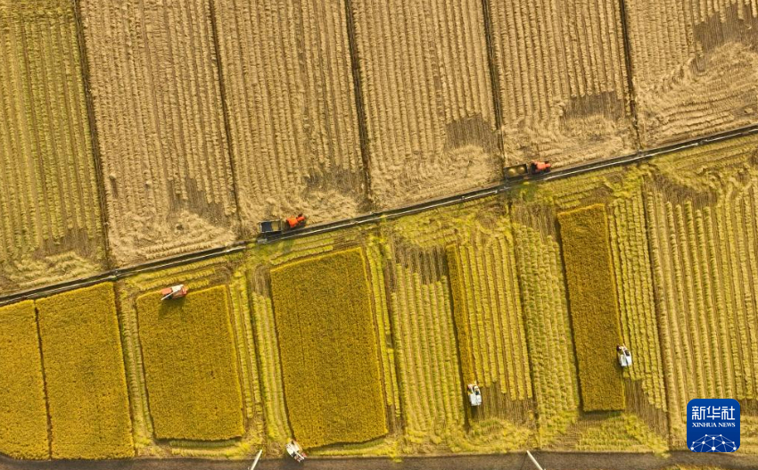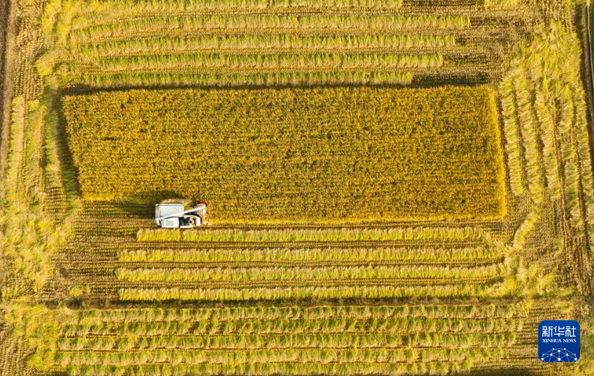 10月12日,在灯塔市东古城子村,水稻收割机在收割水稻(无人机照片)。新华社记者 杨青 摄