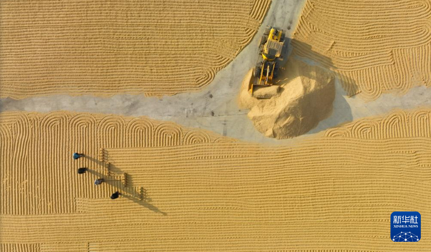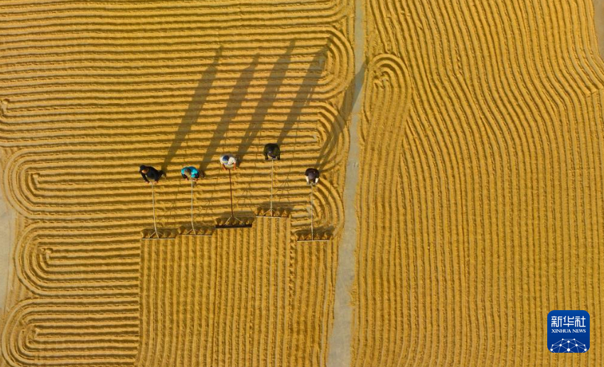 10月12日,在灯塔市禾谷茂源水稻种植专业合作社,农民在晾晒收获的水稻(无人机照片)。新华社记者 杨青 摄pagebreak