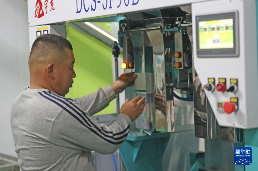 10月12日,在灯塔市禾谷茂源水稻种植专业合作社,农民将水稻磨成大米后包装。新华社记者 杨青 摄