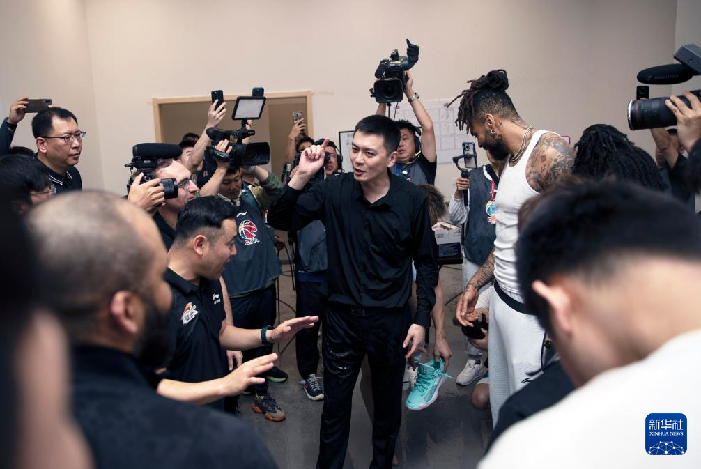 5月22日,辽宁本钢队主教练杨鸣(中)夺冠后在球队更衣室发言。