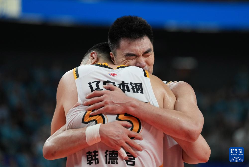 5月22日,辽宁本钢队球员韩德君(前)与队友李晓旭拥抱庆祝夺冠。