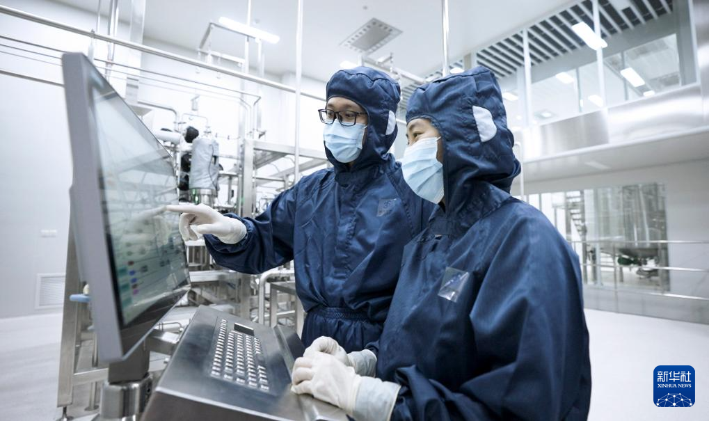 在北方药谷德生生物医药产业园一期抗体原液车间,工艺工程师研究讨论气体流量问题(资料照片)。新华社记者 杨青 摄
