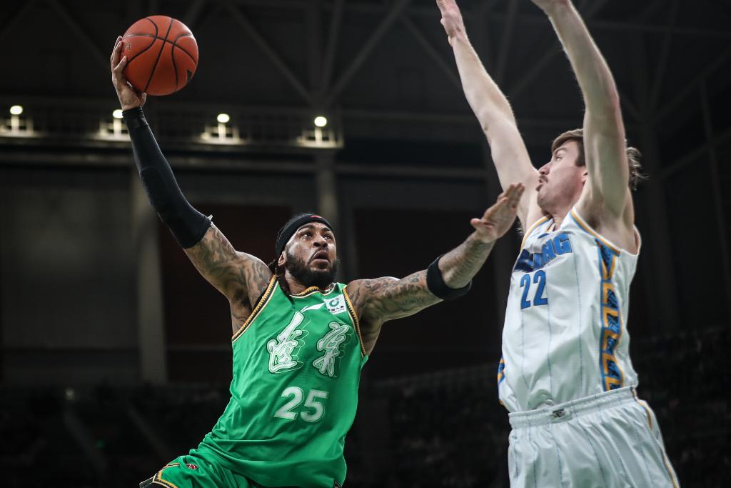 11月12日,辽宁本钢队球员莫兰德(左)在比赛中上篮。新华社记者 潘昱龙 摄