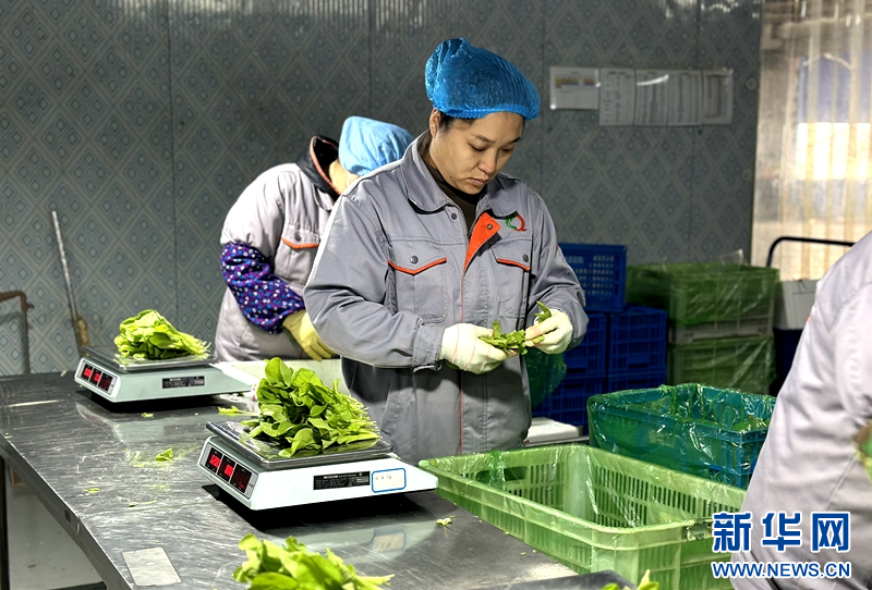 工作人员正在包装采摘好的蔬菜。新华网赵健彤摄