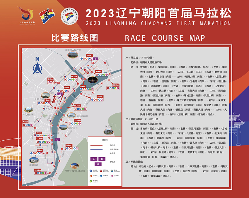 赛事起点设在朝阳市政府广场,全程马拉松赛道以朝阳大街和大凌河为主线,途经万达广场、商业城、兴隆大家庭商业区,北塔公园、佑顺寺、南塔历史文化区,人民公园、大凌河、凤凰山景区,以朝阳南桥为折返点,欢乐跑的终点设于北塔广场,马拉松和半程马拉松终点回到市政府广场。