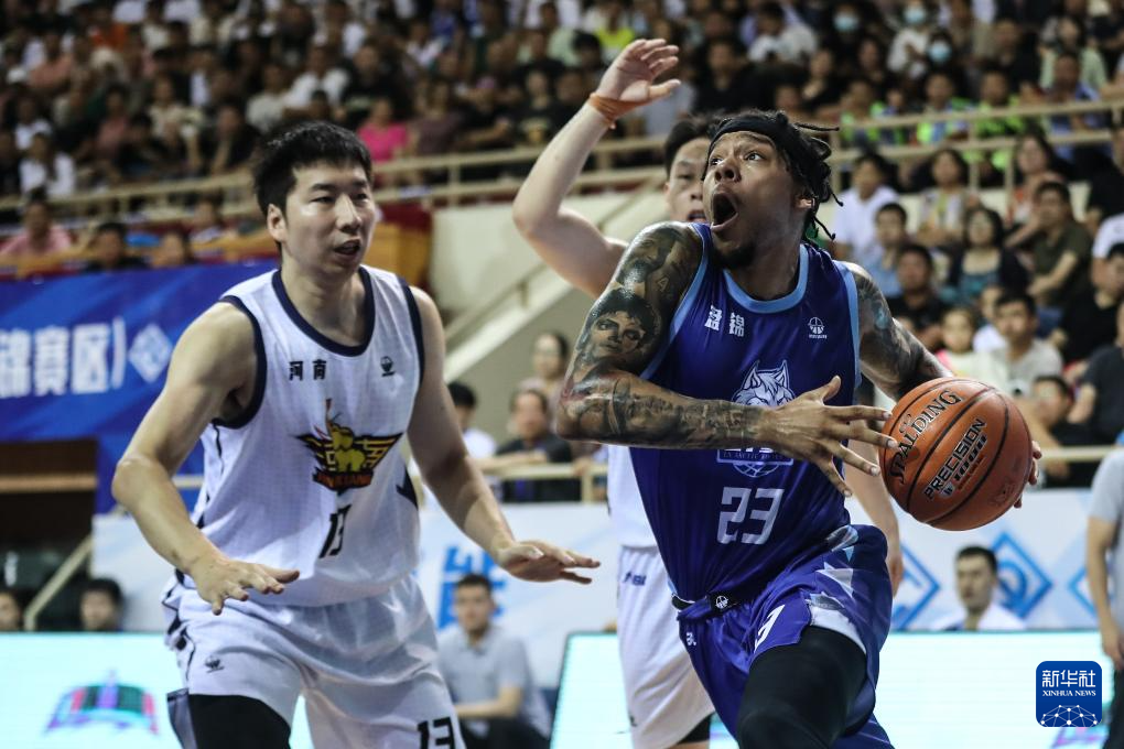 7月26日,河南赊店老酒队球员埃利斯(右)在比赛中上篮。新华社记者 潘昱龙 摄pagebreak