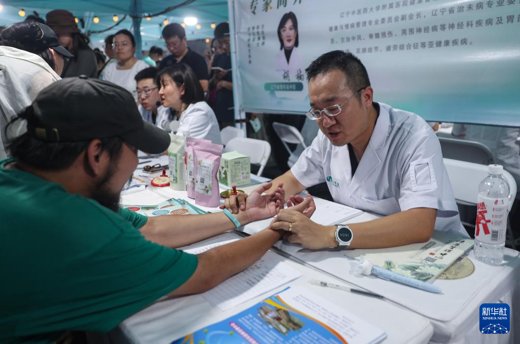 8月9日,在中医药文化夜市的义诊区域,医生为患者号脉。