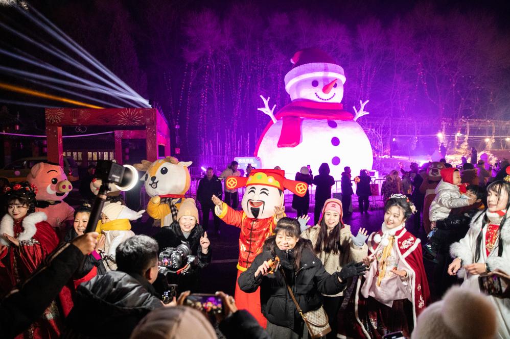 活动现场,既有潮流乐队、舞龙舞狮、npc巡游等演出和互动活动,也有文旅企业现场推介、派发门票和小礼物,烘托出欢乐的节日氛围;高9米的网红大雪人、高45米的千朵莲花山巨幅冰雪画卷等千山元素雪雕,以及“爱如初见”等创意雪雕,吸引众多游客打卡拍照;从千山正门至灵岩寺景区约1.5公里的范围内,设置了四大篇章、16个主题的花灯,点燃了千山的浪漫夜色;赏灯沿途,还有南果梨奶茶、牛庄馅饼等二十余种南北特色美食及剪纸、草编、糖画等各式非遗产品展销,吸引游客驻足品尝购买。