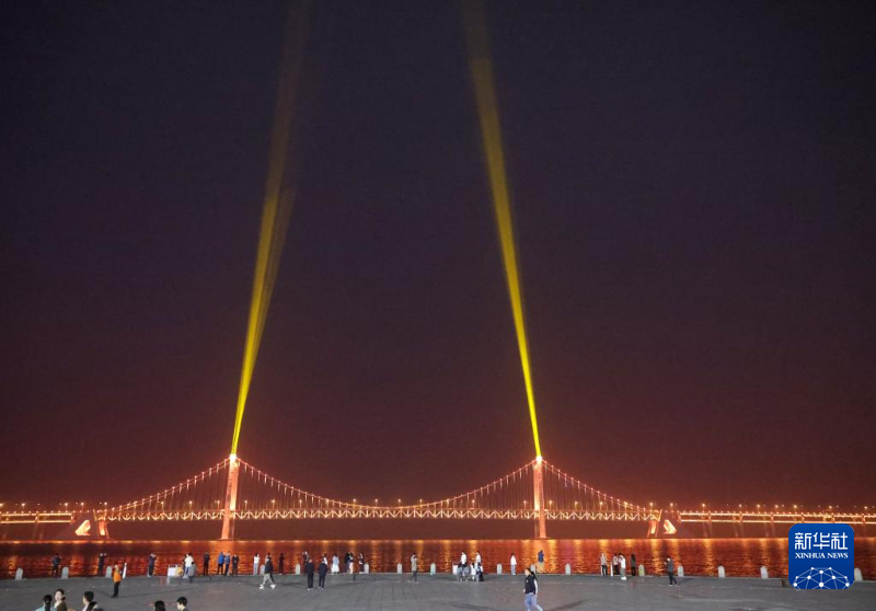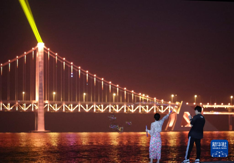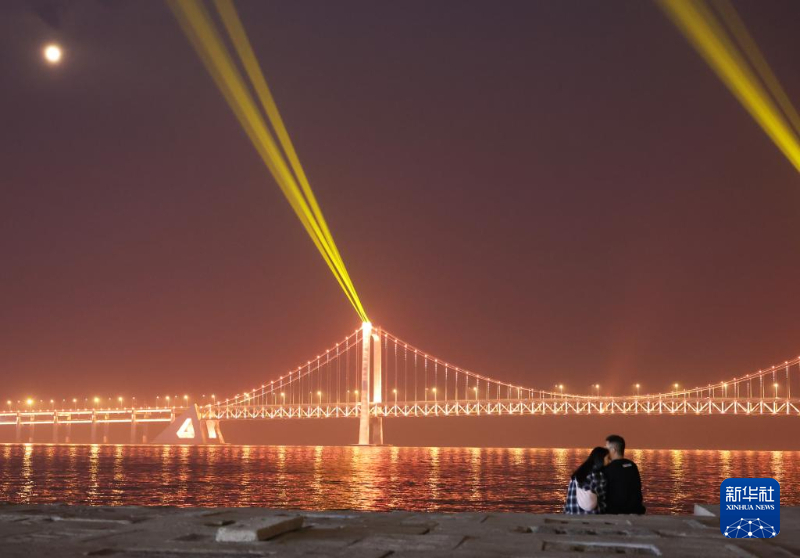 游客在观赏大连星海湾大桥的光影秀(5月23日拍摄)。