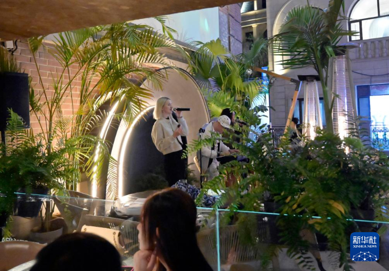 在大连的东方威尼斯水城,演员在一家餐厅为前来就餐的顾客演出(5月16日摄)。