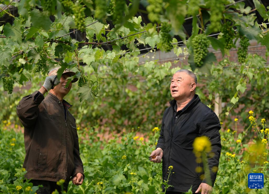 4月15日,在辽宁省阜新蒙古族自治县于寺镇官营子村的特色水果暖棚,村民在修剪葡萄枝。