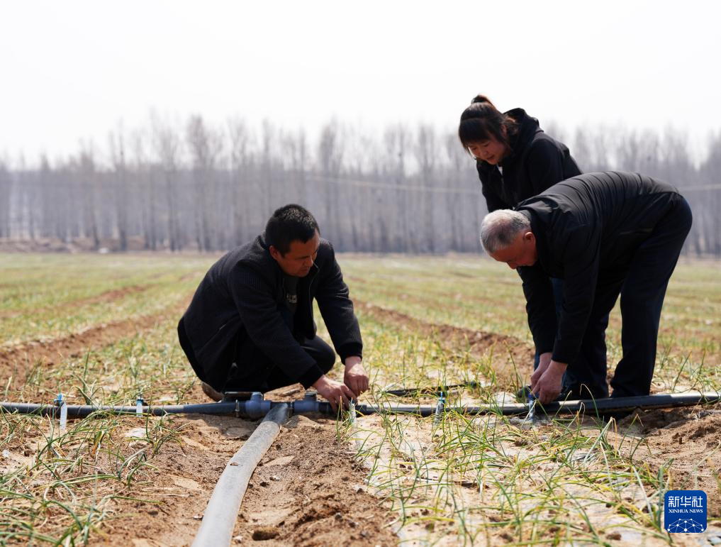 4月15日,在辽宁省阜新蒙古族自治县于寺镇官营子村,村民在检查圆葱种植地里的滴灌带。