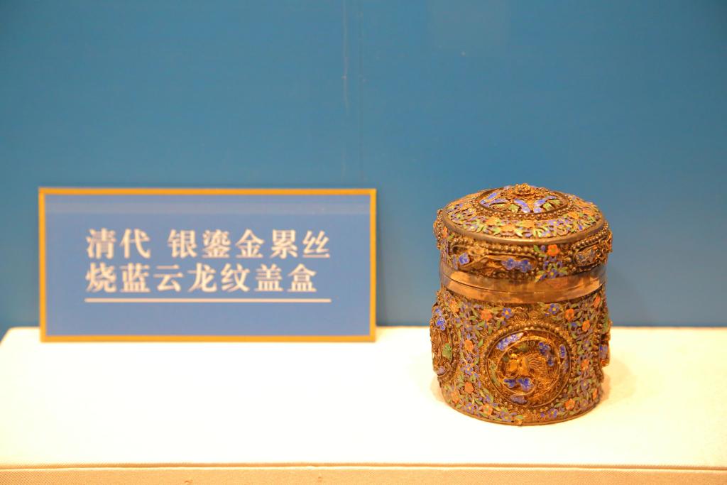 展览分为“南粤广州‘一口通商’”和“外销珍品琳琅满目”两个单元,展出了“广彩人物纹包袱纹瓶”“翠绿绸地绣庭院人物纹女上衣”“银鎏金累丝烧蓝云龙纹盖盒”等文物,都是既具浓厚中国色彩又略带西方艺术风格的外销艺术精品。