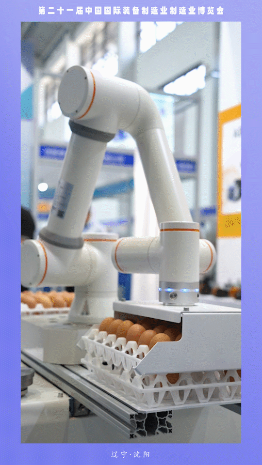 机械手臂轻抓托盘,将5×6的鸡蛋方阵挪移到空中,稳稳堆叠入垛。“这是我们为农产品加工厂开发的柔性机械手臂,握力轻柔到可以抓起一枚鸡蛋。”辽宁艾弗艾传动控制技术有限公司技术员邹容介绍。