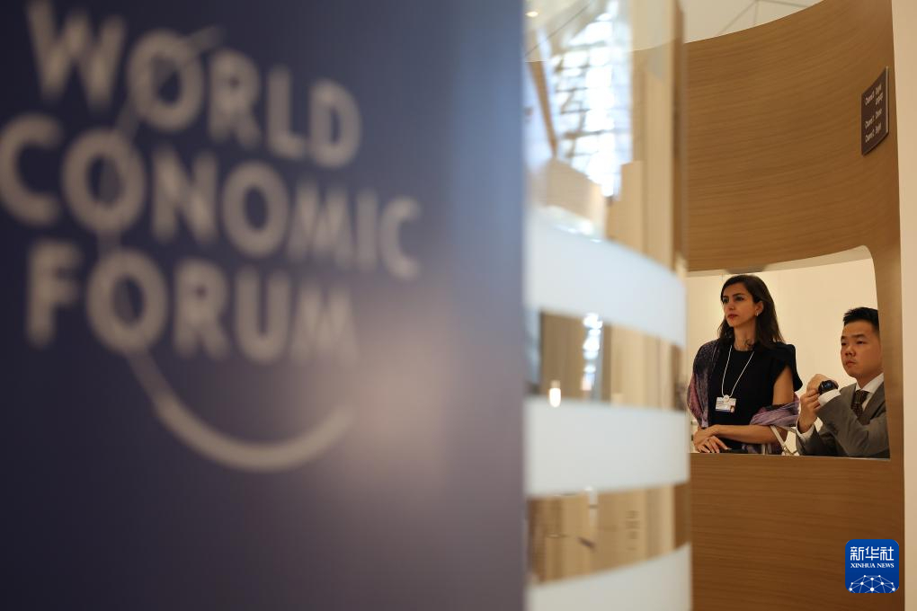 6月26日,两位嘉宾在夏季达沃斯论坛主会场大连国际会议中心互动空间的窗口外观看互动讨论。新华社记者 姚剑锋 摄pagebreak