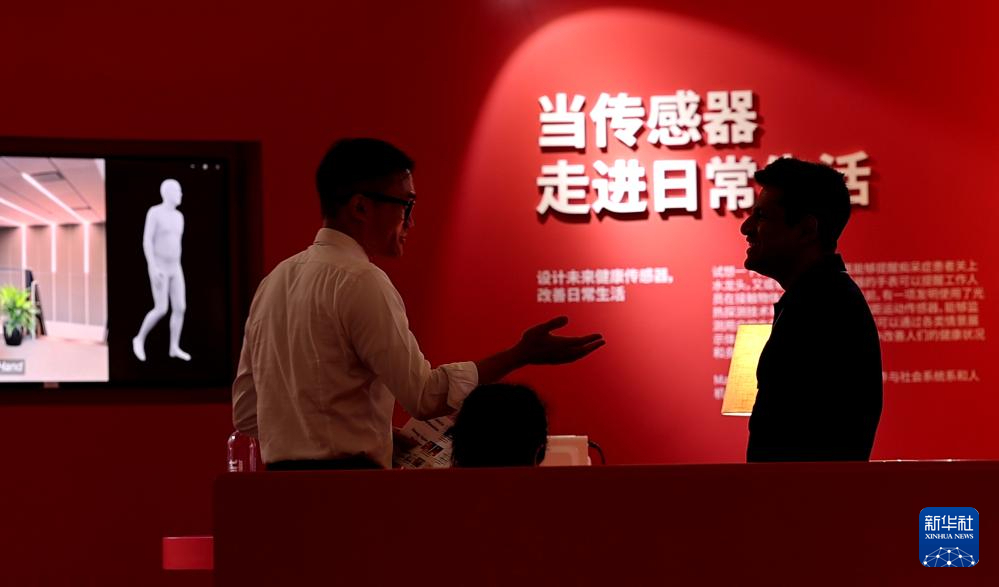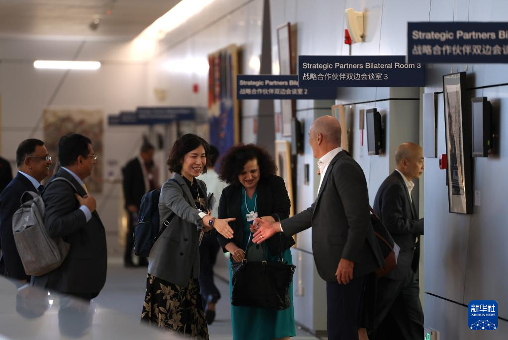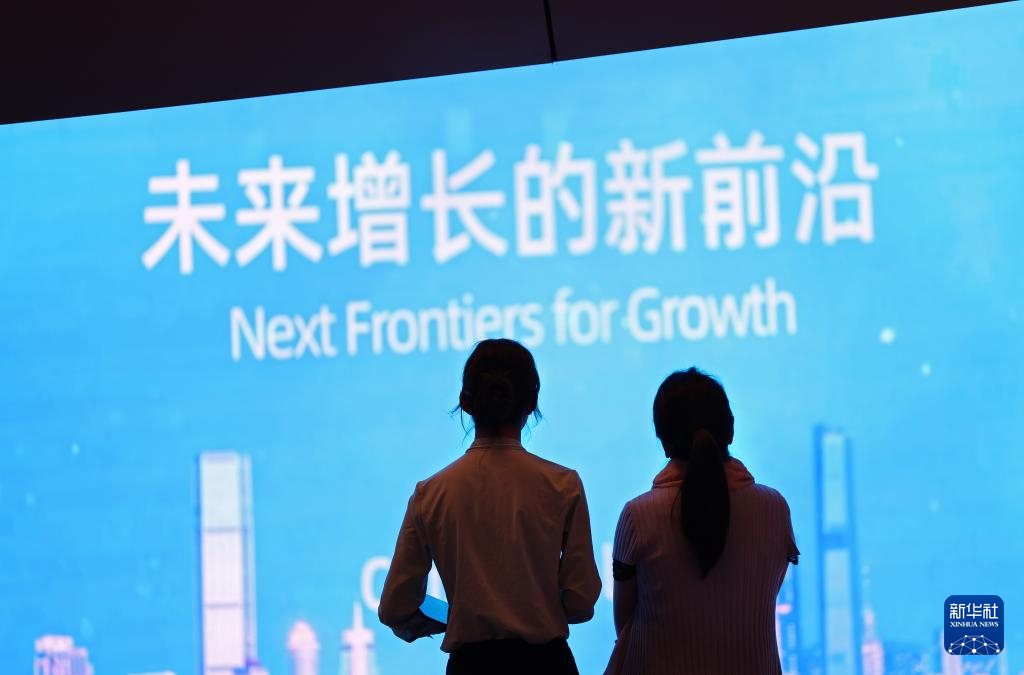 6月25日,两位嘉宾在夏季达沃斯论坛主会场大连国际会议中心展示区交流。新华社记者 姚剑锋 摄pagebreak