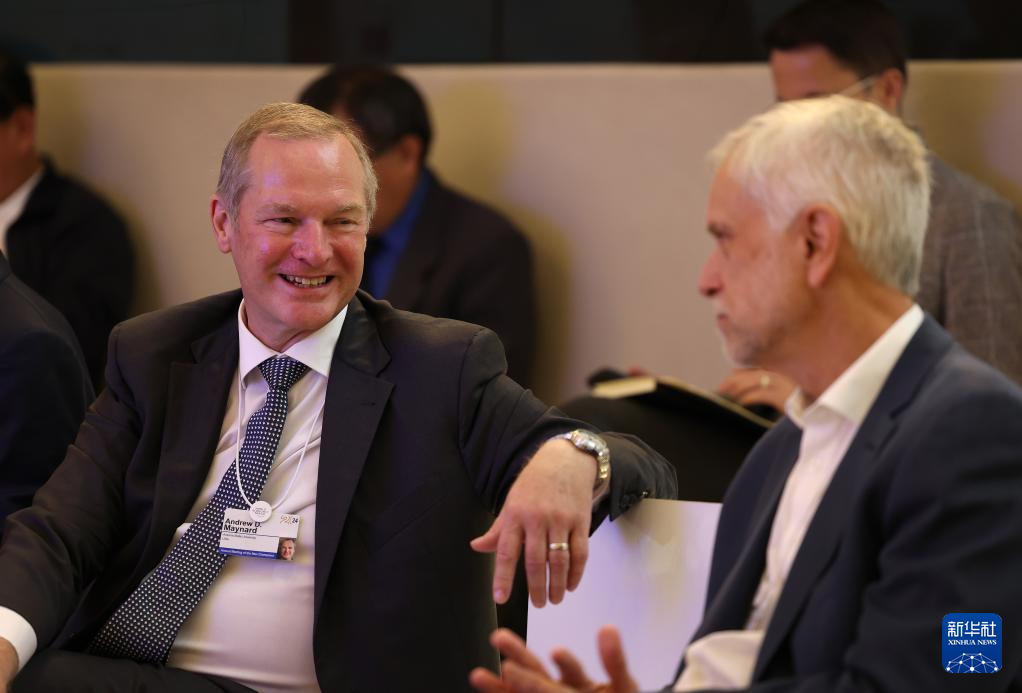6月26日,两位嘉宾在夏季达沃斯论坛主会场大连国际会议中心外交流。新华社记者 姚剑锋 摄