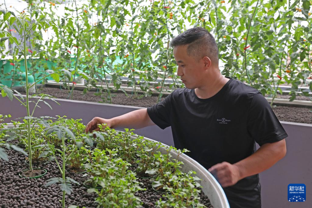 7月27日,工作人员在辽宁阜新韩家店镇下王村“虾菜共生”示范园内检查无土栽培的蔬菜根须。
