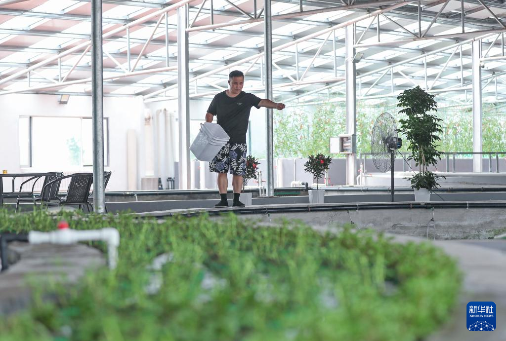 7月27日,工作人员在辽宁阜新韩家店镇下王村“虾菜共生”示范园内查看南美白对虾的长势。