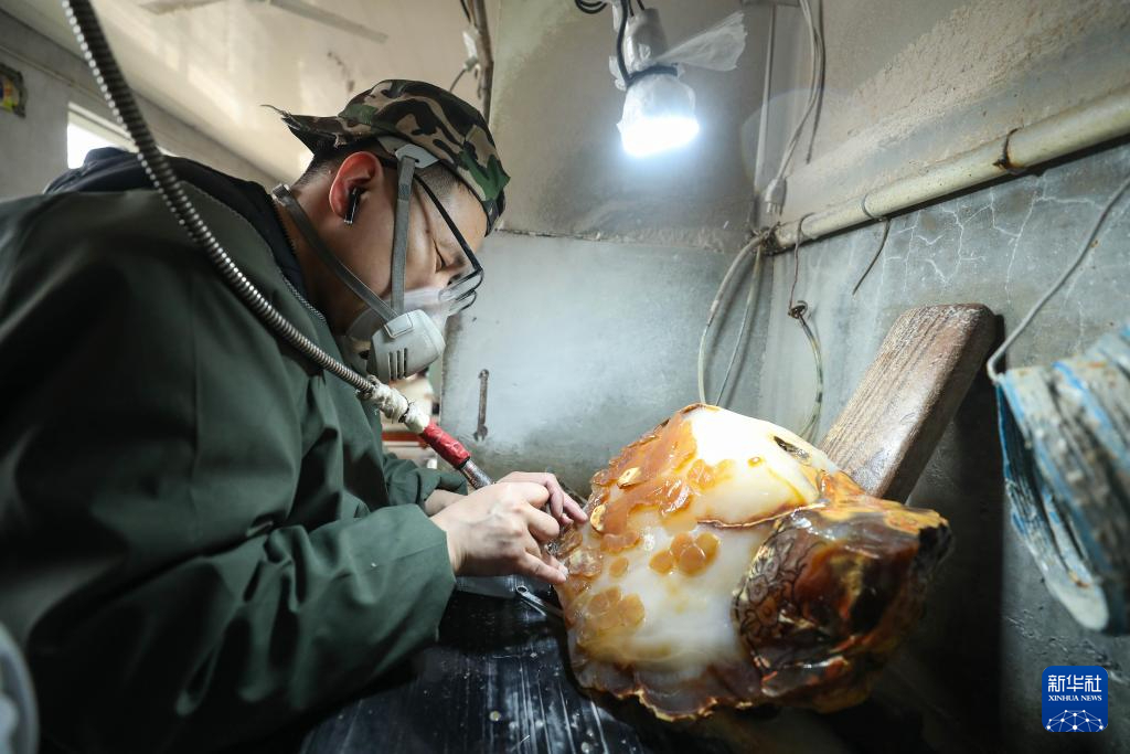 4月24日,在阜新蒙古族自治县十家子镇的一家玛瑙加工厂,雕刻师雕刻玛瑙工艺品。新华社记者 龙雷摄pagebreak