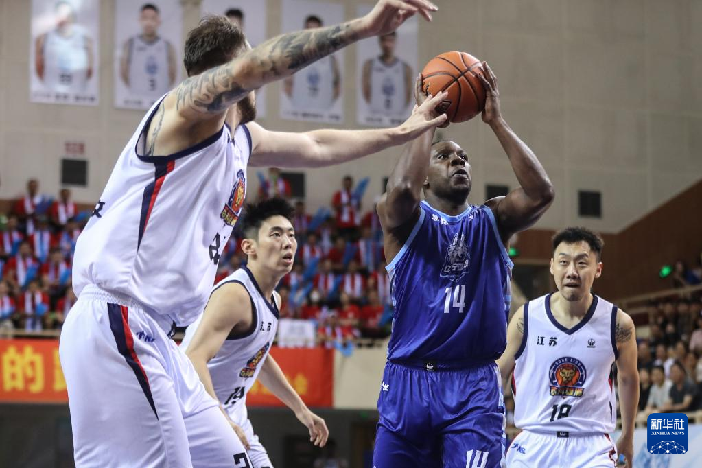7月16日,江苏盐南苏科队球员巴尔文(右)在比赛中上篮。新华社记者 潘昱龙 摄
