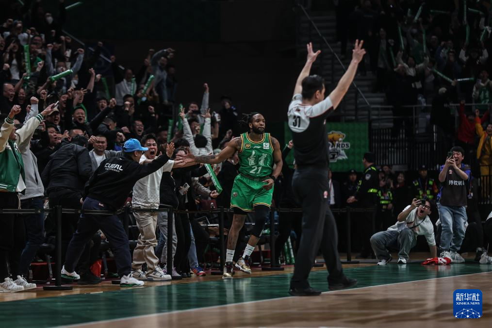 4月13日,辽宁队球员威尔斯投进绝平三分后庆祝。新华社记者 潘昱龙 摄